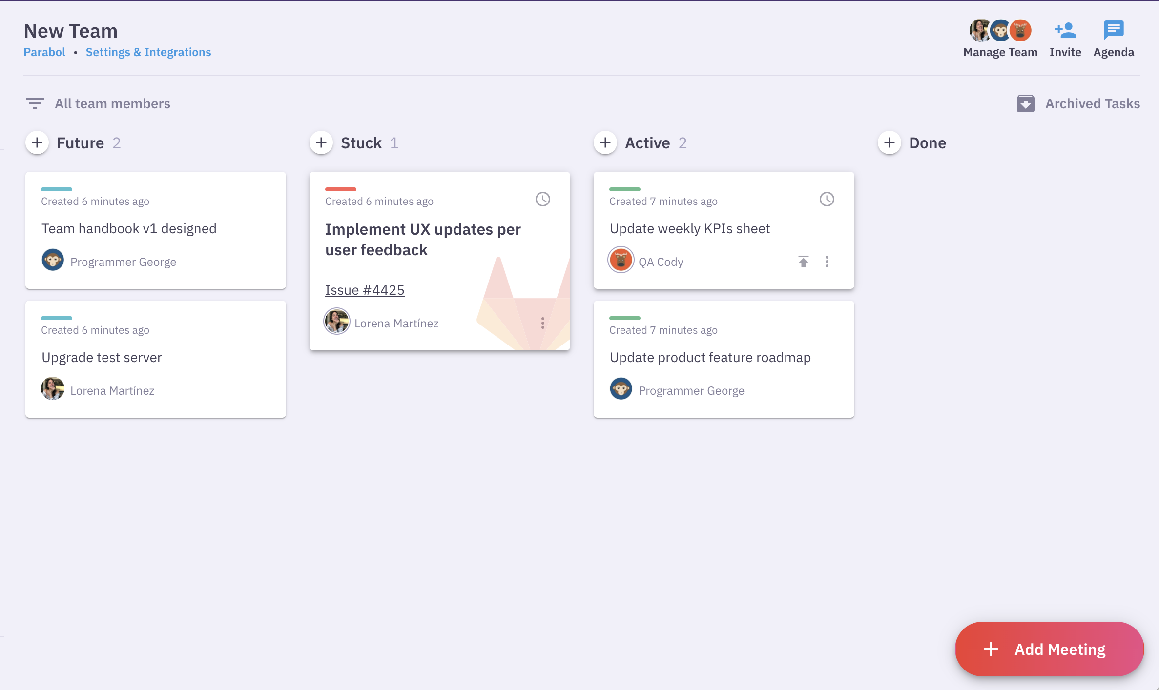 Parabol lets teams hold engaging retrospective meetings through anonymous reflections, multi-player grouping and voting, and guided discussions. Choose from retrospective templates based on best practices or customize your own to suit your team’s needs.