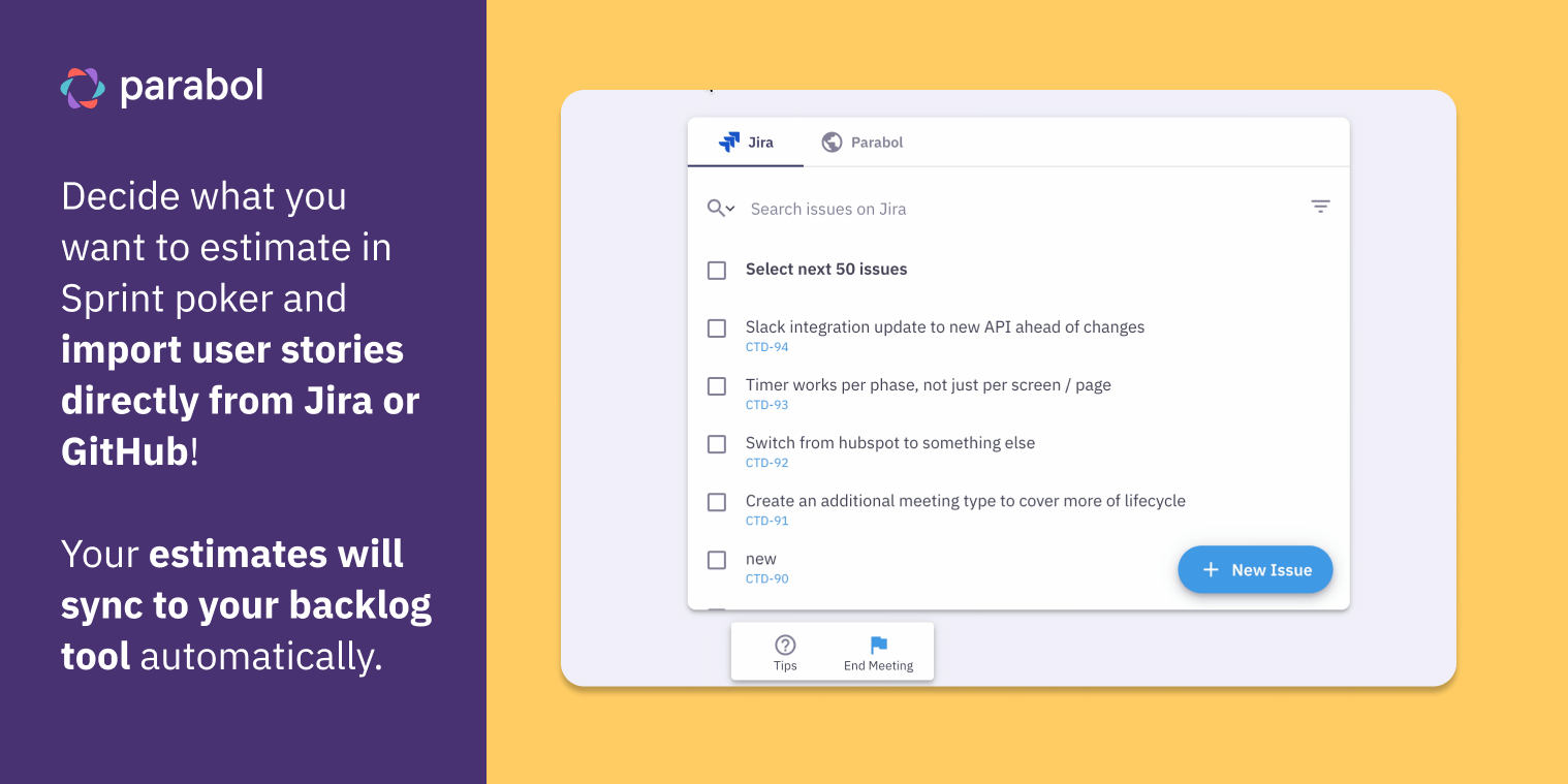 When your backlog items are sufficiently detailed, make a list of the ones you want to select for estimation during the meeting. Our Sprint Poker tool lets you import your tasks and stories directly from product backlog in Jira or GitHub before the meeting begins, so they’re ready for the team to estimate.
