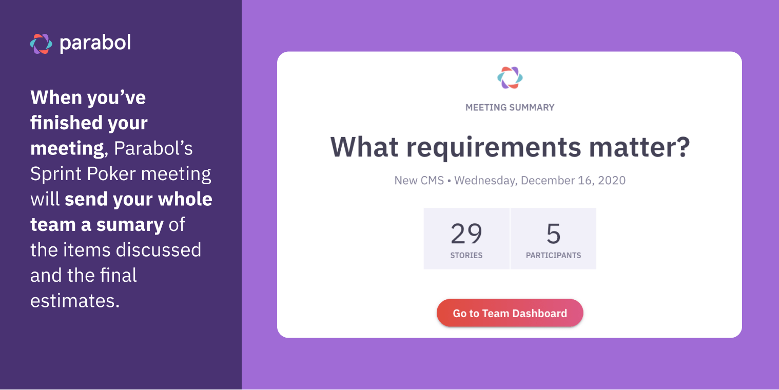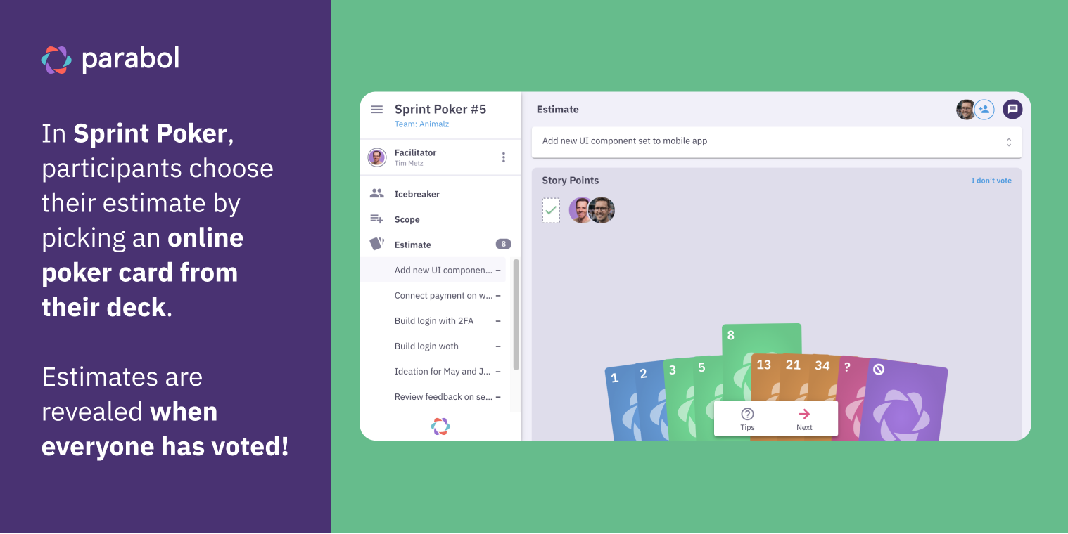 Parabol’s Sprint Poker tool guides you through this process automatically, making it easier to have a successful planning poker meeting.