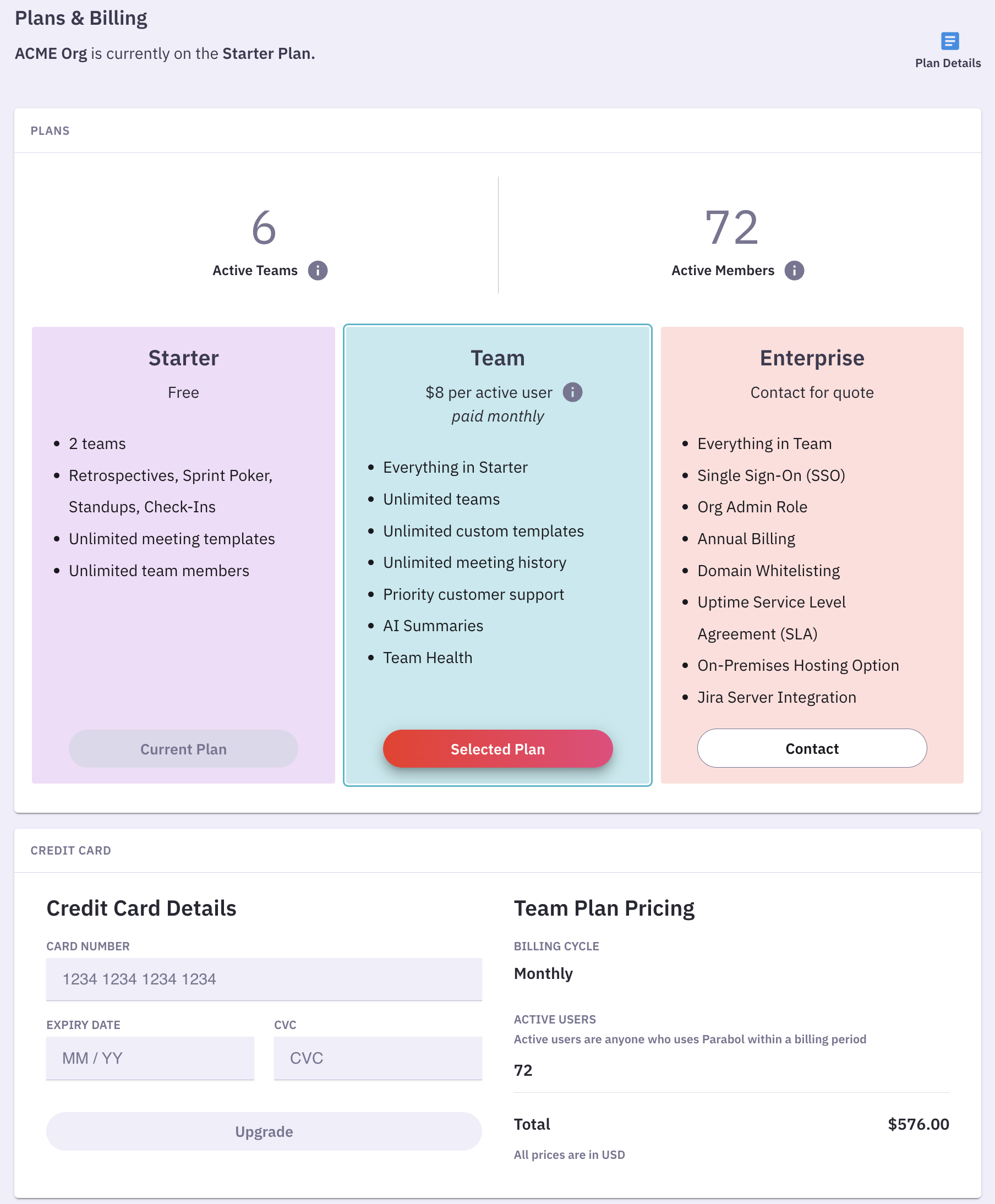 In order to upgrade your Parabol organization from Starter to Team, follow the steps on this page.
