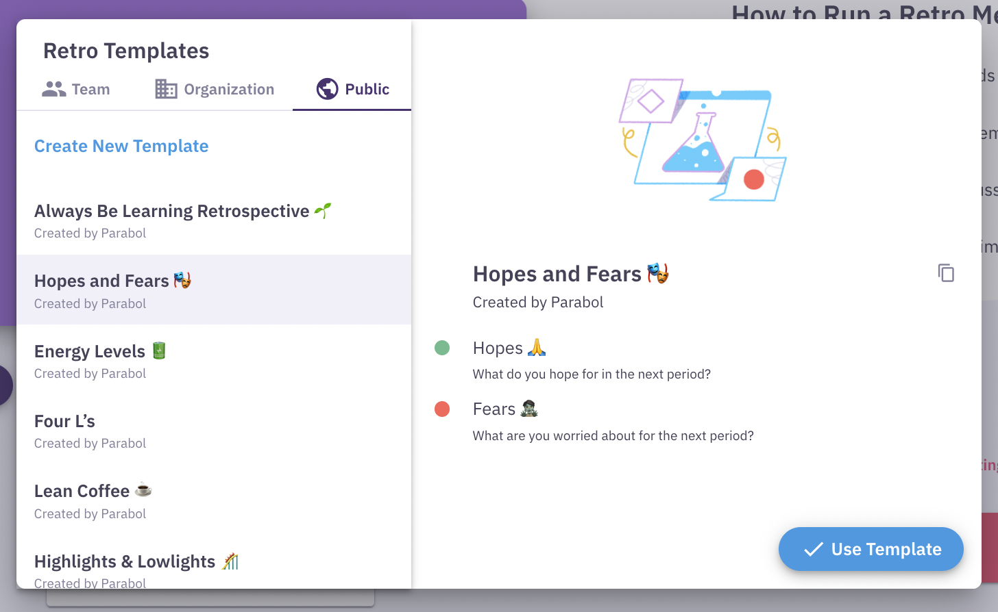 Jump into Parabol and select Retro Meeting with the arrows, then use the dropdown to select the Hopes and Fears retrospective template. This is where you’ll find Parabol’s library of 40+ pre-made and customizable retrospective templates.