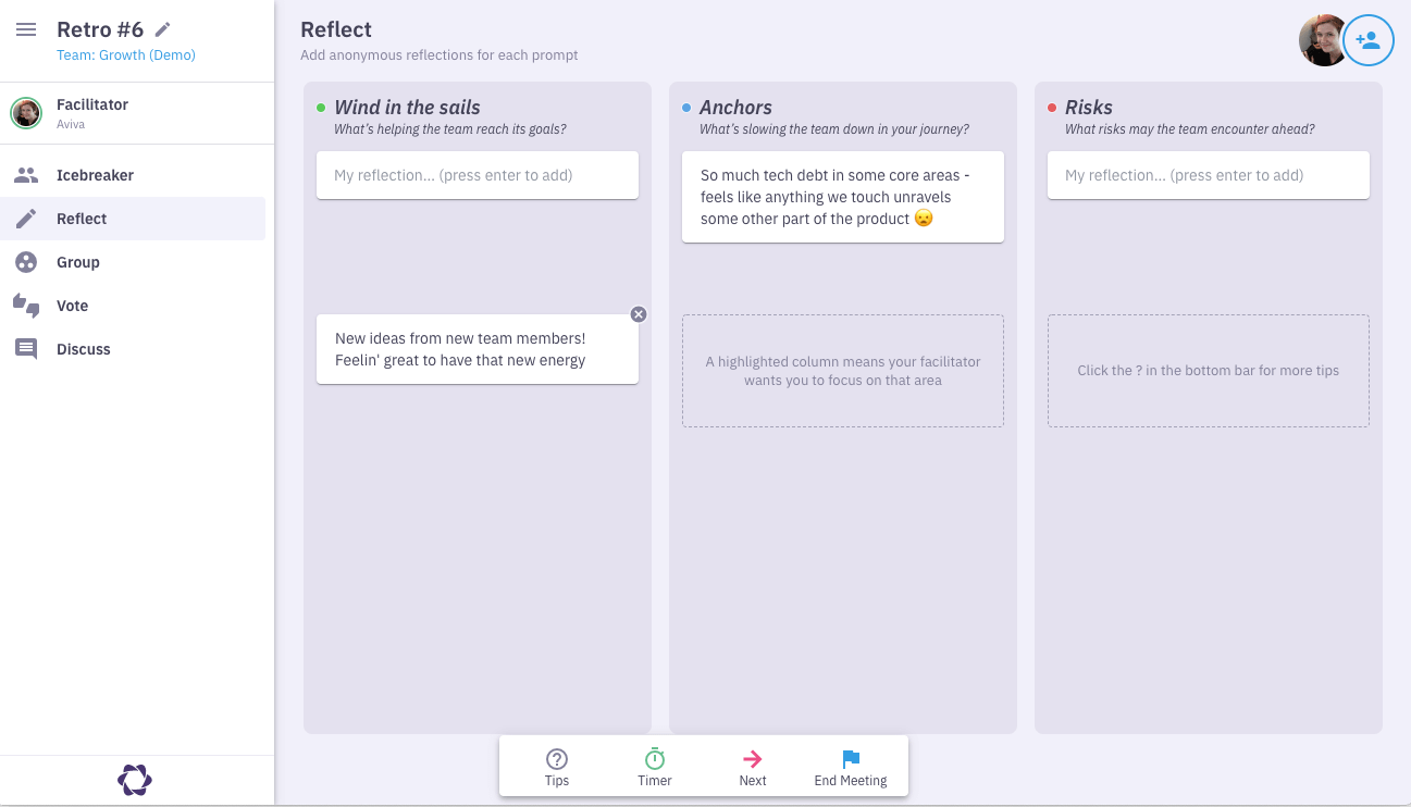 After the Icebreaker you’ll move on to the reflect stage. This is where you brainstorm what your island, rocks, anchor and wind are. Afterwards, you’ll group themes, do dot voting and finally set action items so you can chart a bold path forward.