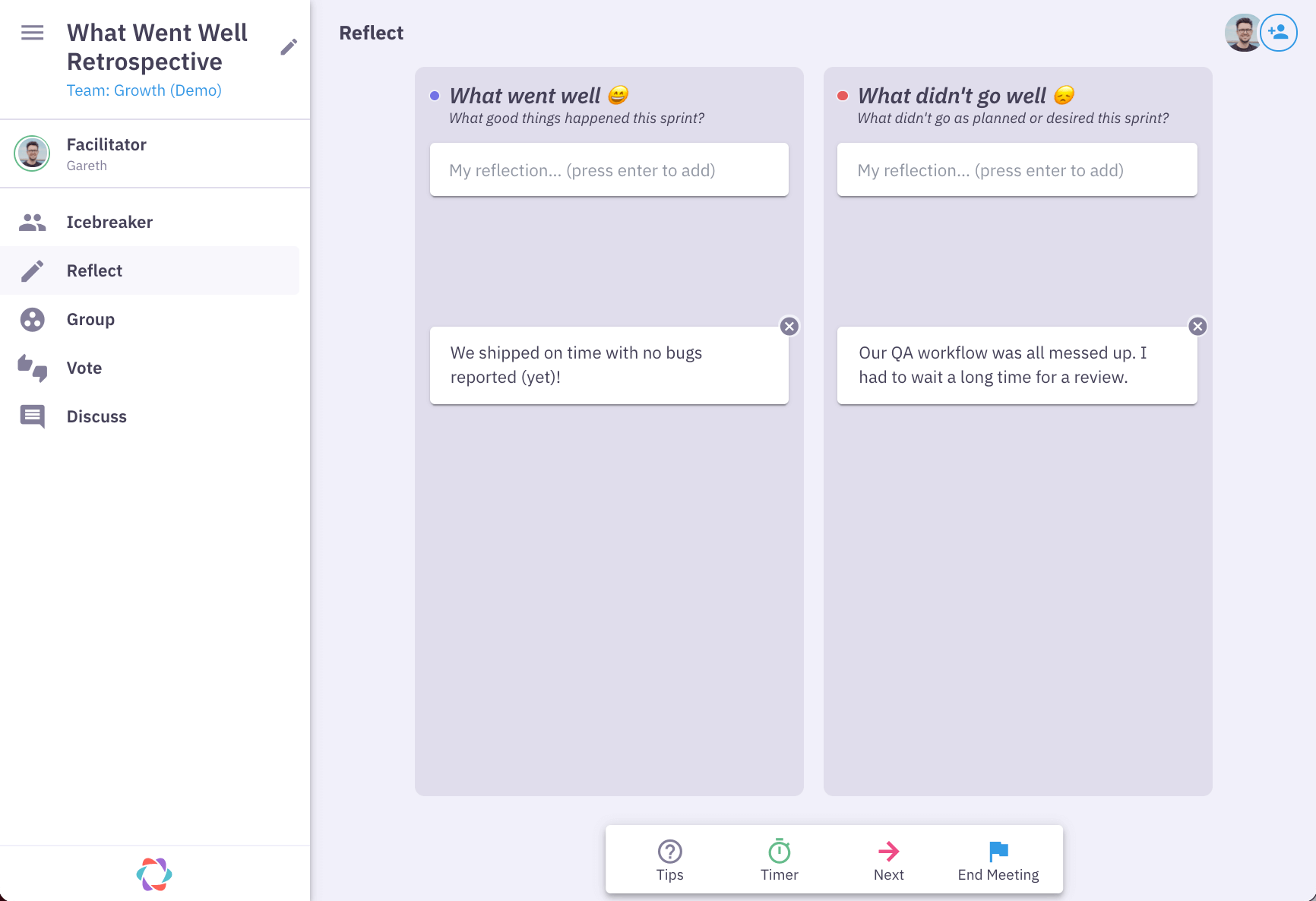 After the icebreaker you’ll move on to the reflect stage. This is where your team will do all their ideation and brainstorm in silence using the prompts above. All reflections are kept anonymous at this stage to prevent groupthink.
