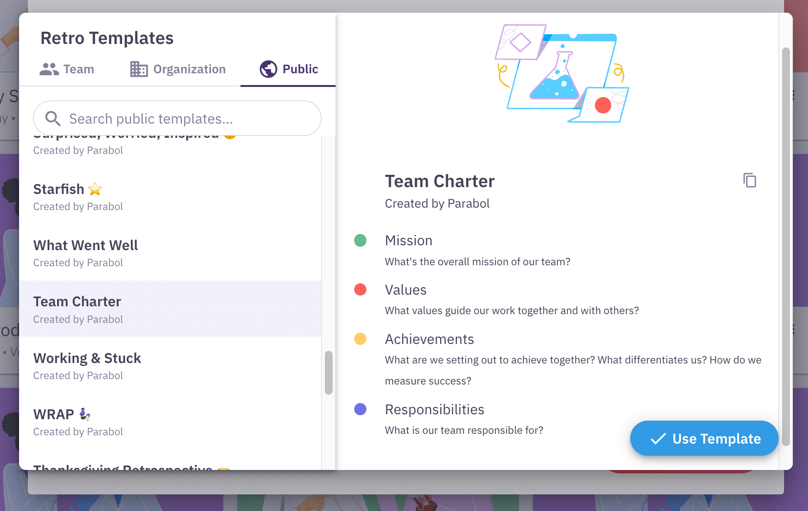 Once you’ve selected “retrospective”, browse through Parabol’s library of 40+ pre-made and customizable retrospective formats. Find the Team Charter template and select it.